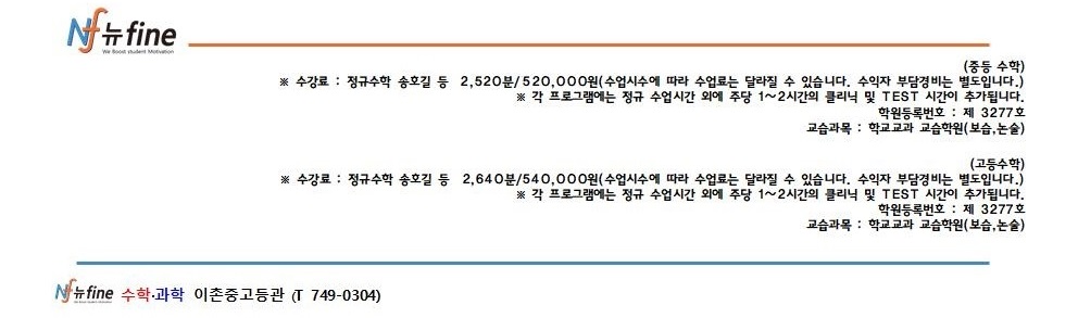 뉴파인학원(이하 ‘학원’)은 개인정보 보호법에 명기된 관련 법률 상의 개인정보처리자가 준수하여야 할 개인정보보호 규정을 준수하며, 관련 법령에 의거하여 이용자의 권익 보호에 최선을 다하고 있습니다. 아래 내용을 충분히 숙지하신 후 본인이 직접 동의란에 서명해 주시기 바랍니다.