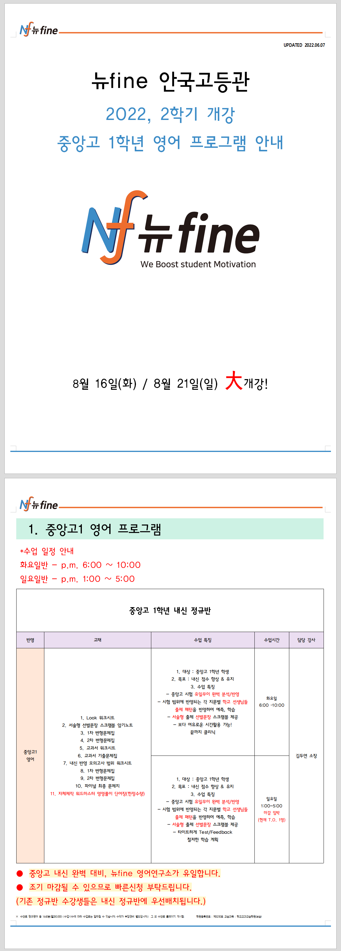 중앙고 고1 영어 프로그램(8/16,8/21 개강)