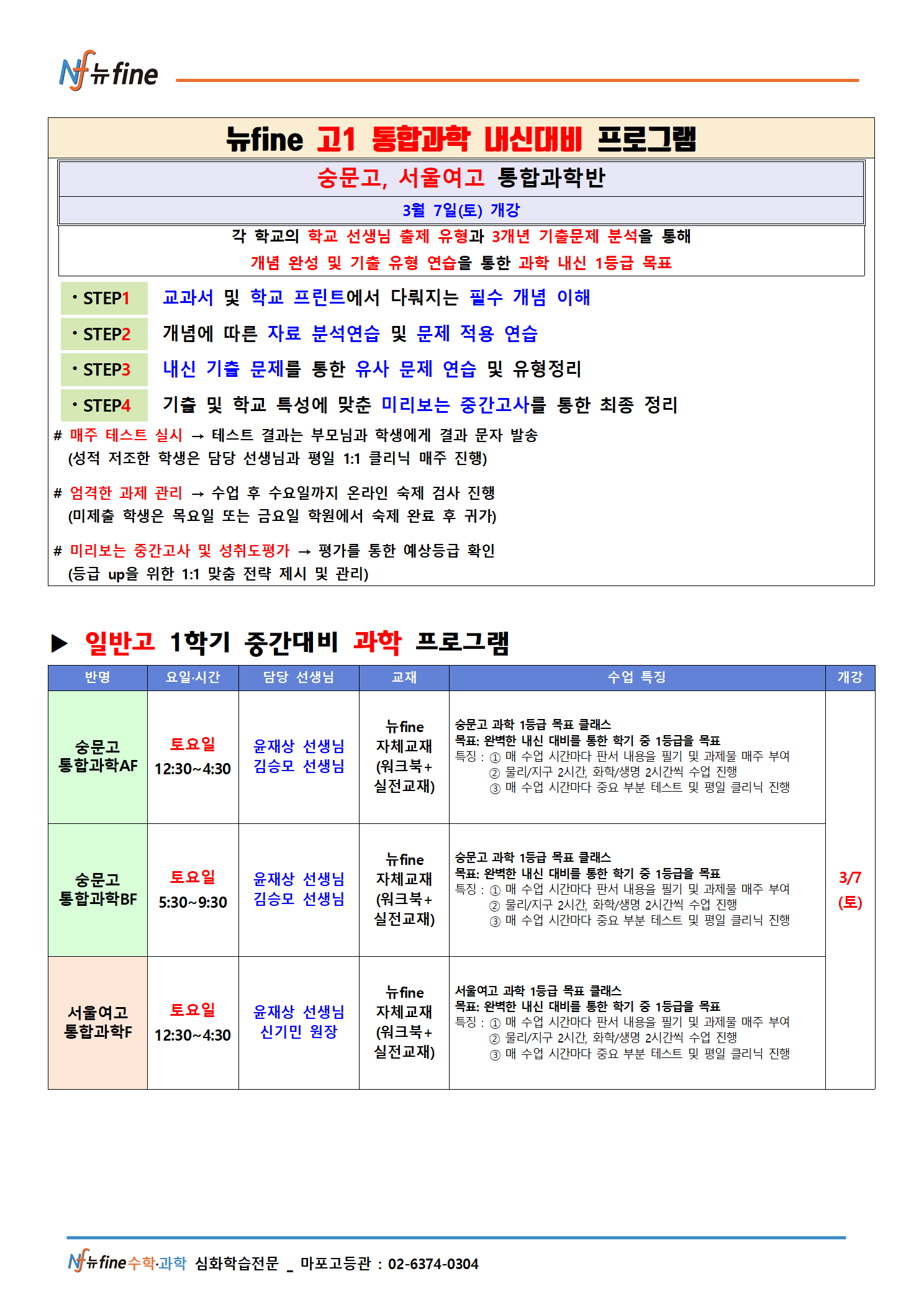※수강료 고등과학1[1,440분/월310,000원], 고등과학2[1,320분/월260,000원]