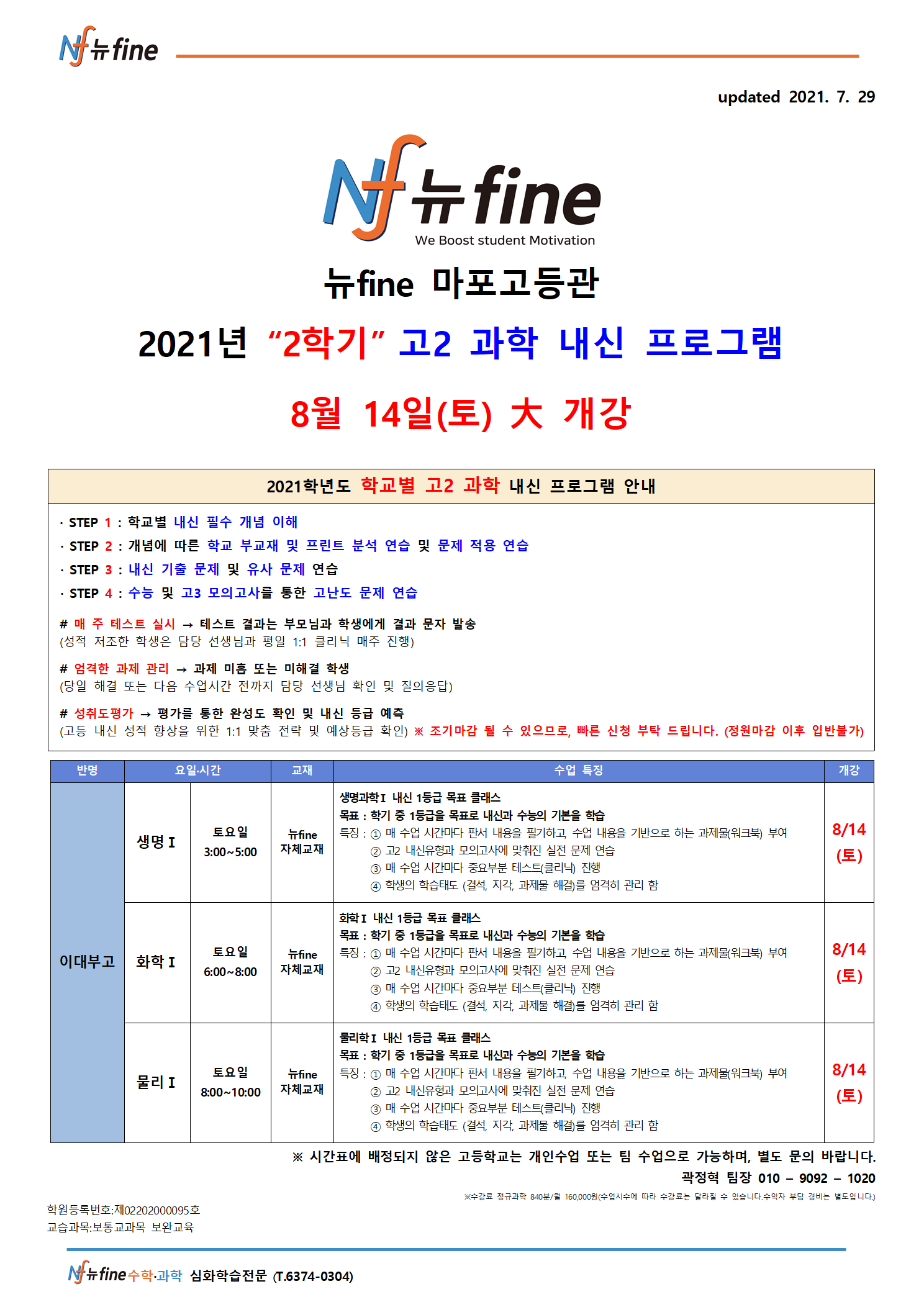 2021년 8월 [2학기] 마포고등관 고2 과학프로그램