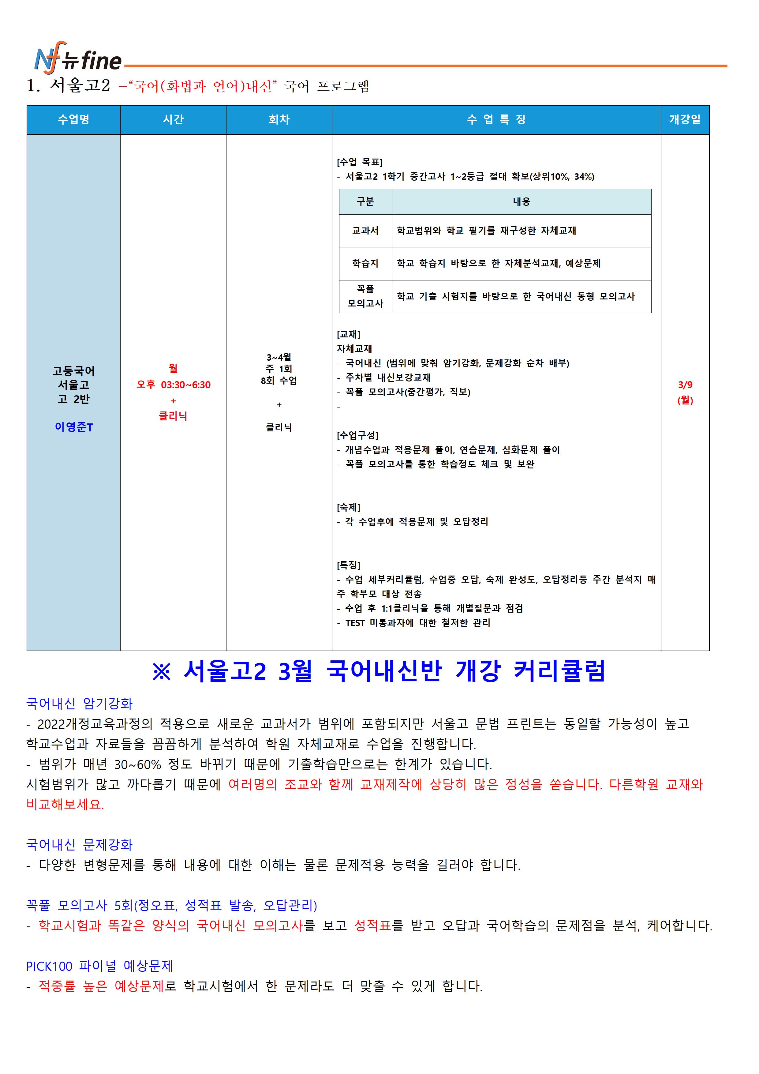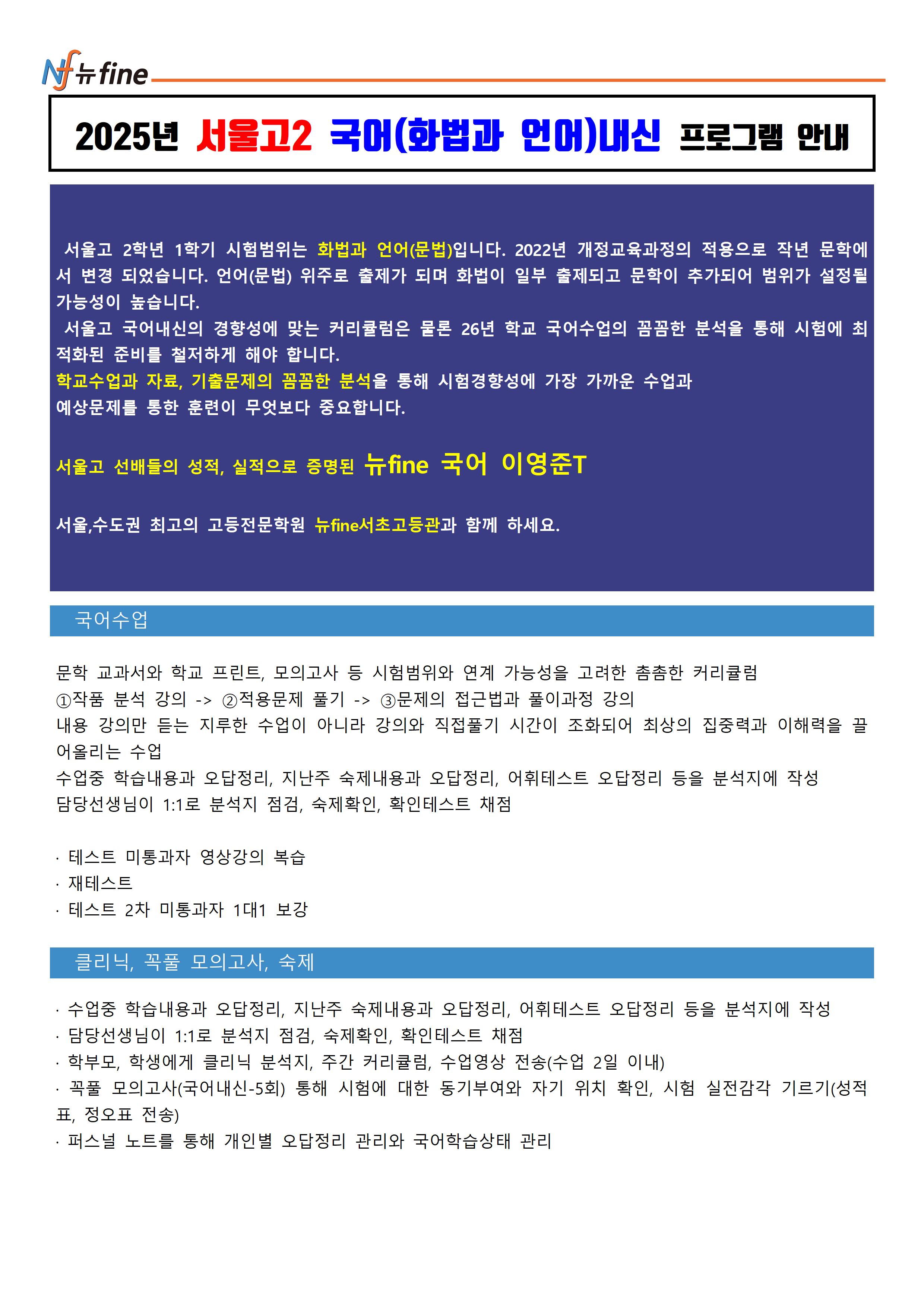 1학기 내신대비 고2 국어 프로그램