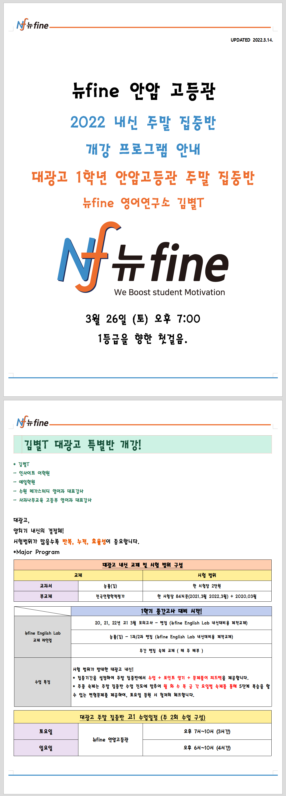 2022년 3월 안암고등관 중간고사 내신대비 대광고1 영어 프로그램
