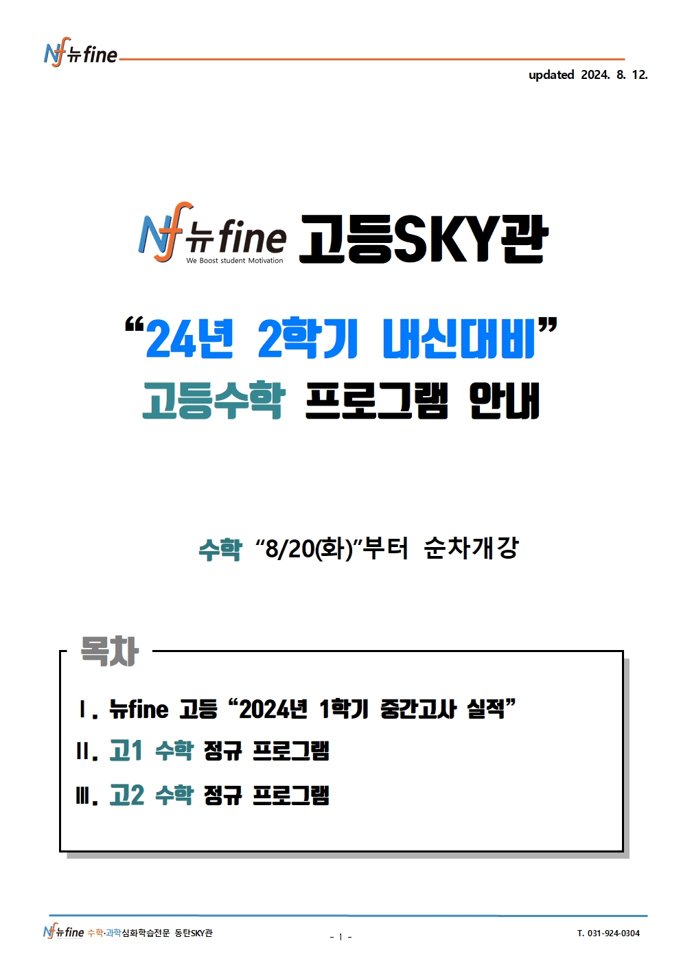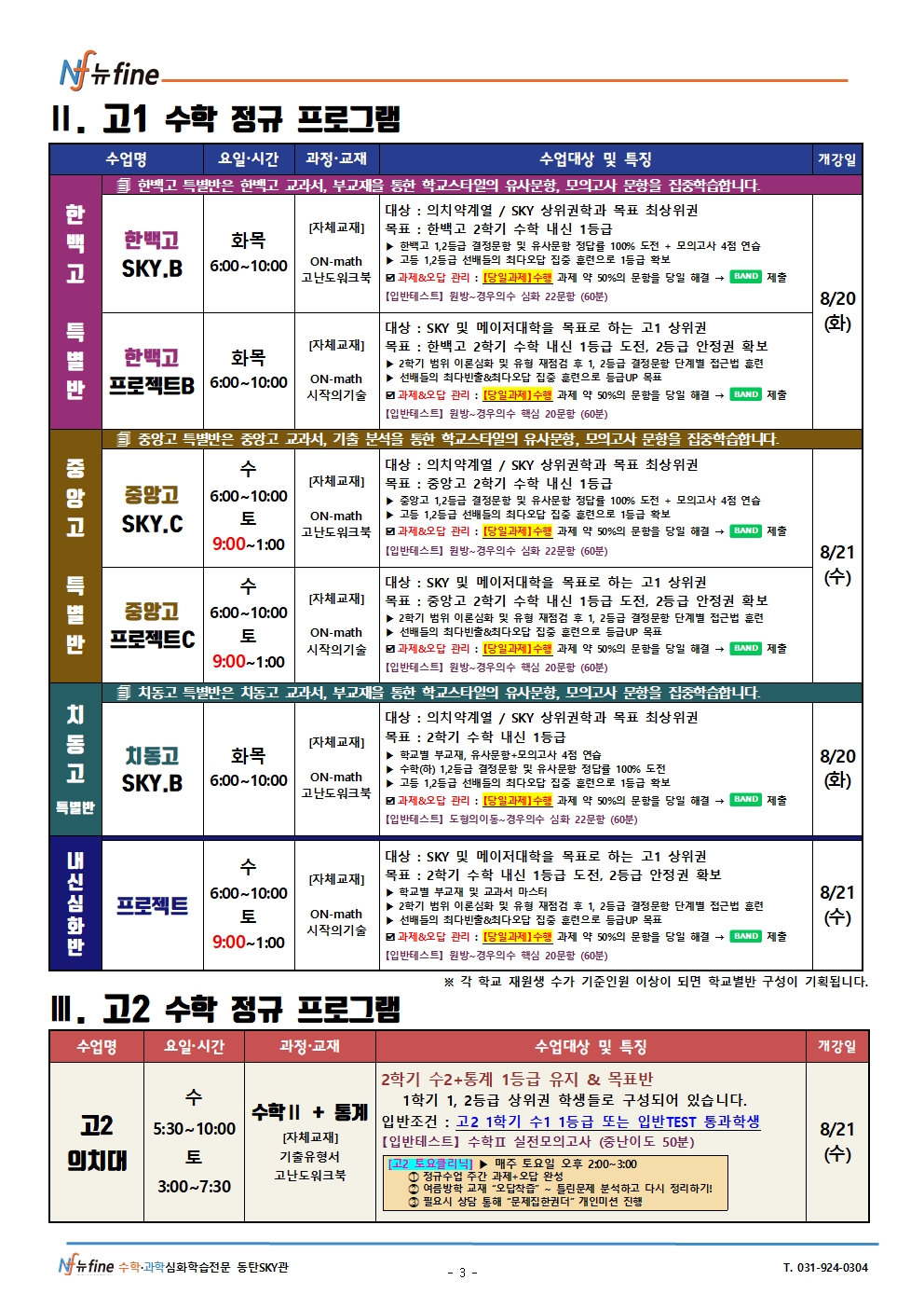 2024년 뉴fine 고등SKY관 고1, 2 수학 2학기 내신대비 프로그램(한백고/중앙고/치동고)