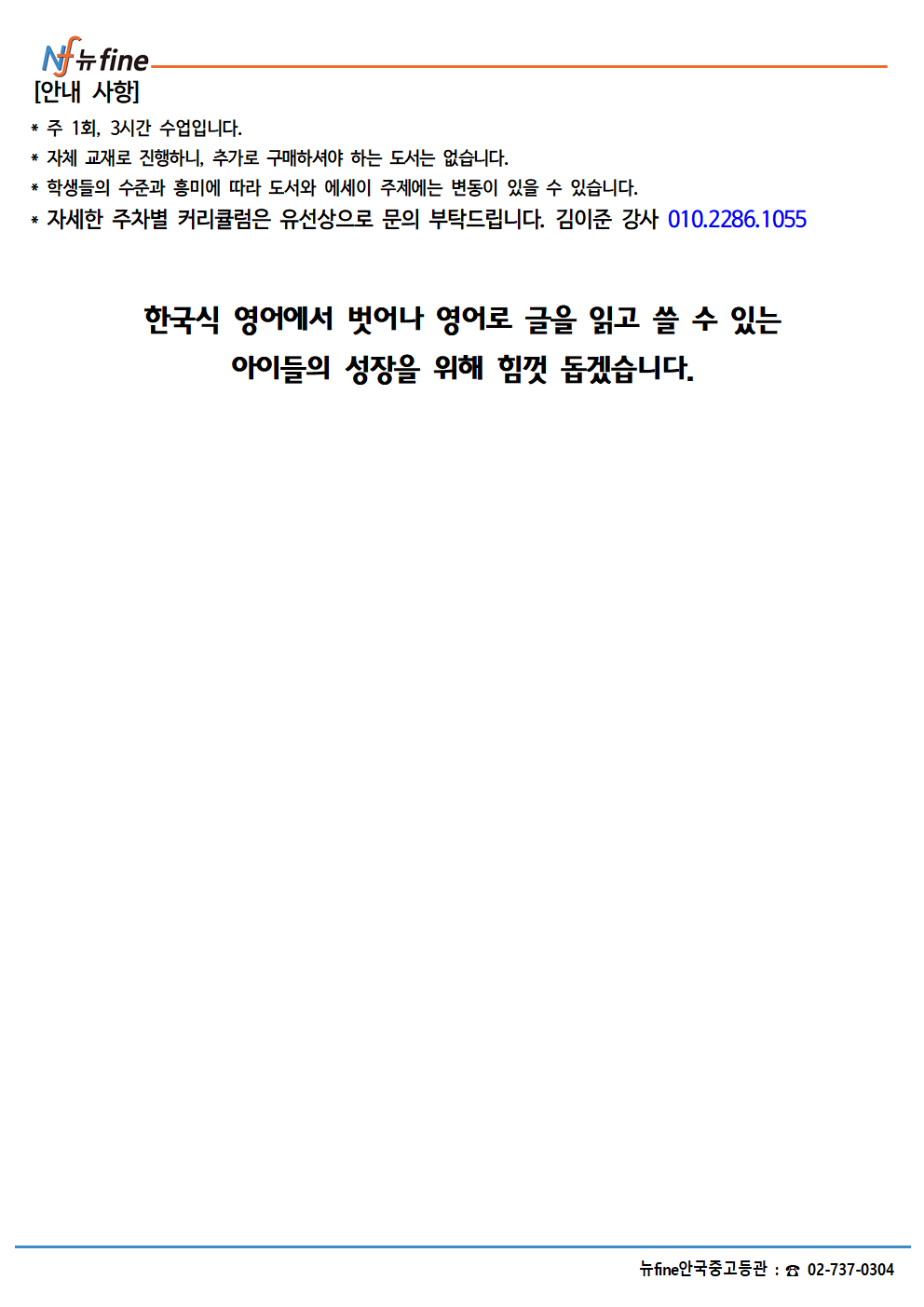 뉴파인학원(이하 ‘학원’)은 개인정보 보호법에 명기된 관련 법률 상의 개인정보처리자가 준수하여야 할 개인정보보호 규정을 준수하며, 관련 법령에 의거하여 이용자의 권익 보호에 최선을 다하고 있습니다. 아래 내용을 충분히 숙지하신 후 본인이 직접 동의란에 서명해 주시기 바랍니다.