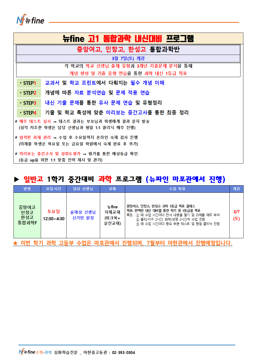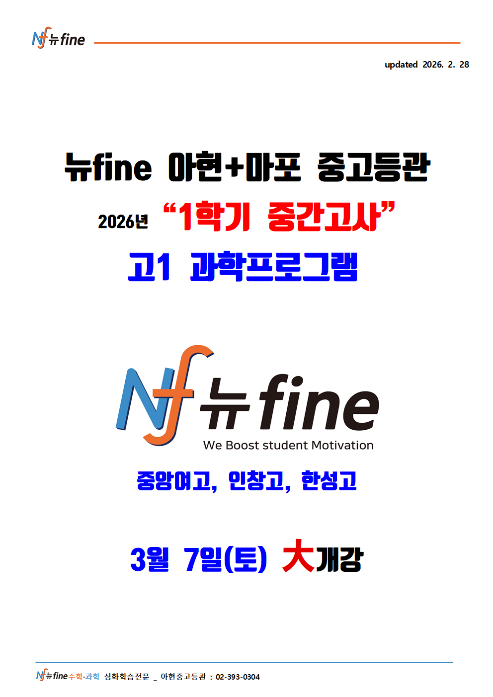 2026년 아현관 중앙여고1/인창고1/한성고1 과학프로그램(3월개강)