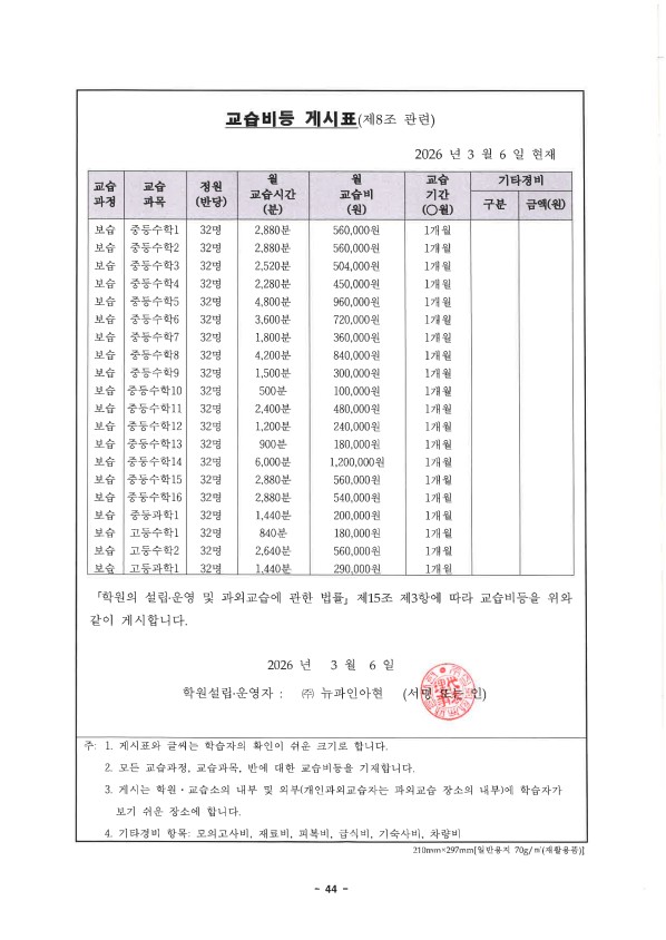 2026년 아현관 교습비 게시표